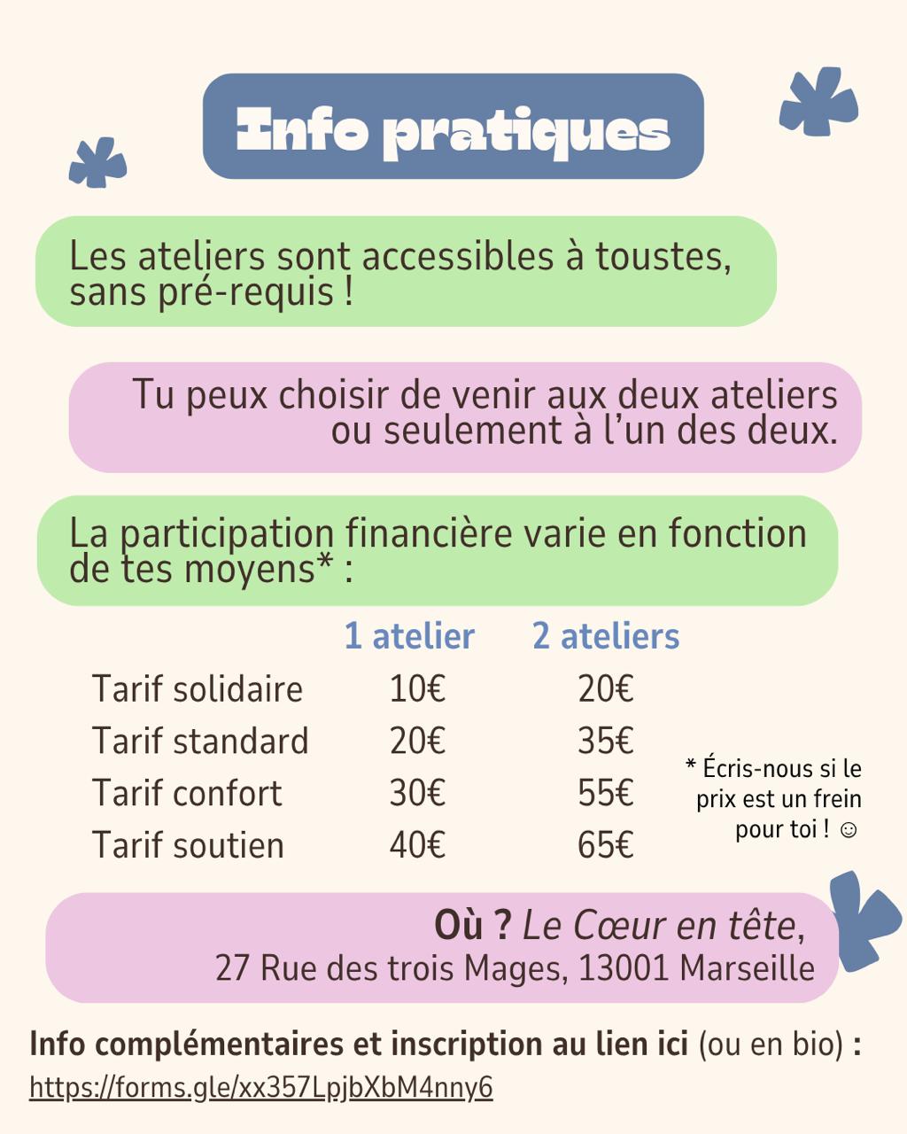 Cet atelier est accessible à toustes, sans pré-requis. Nous introduirons les deux ateliers par un cadre de consentement commun qui nous permettra de naviguer dans nos explorations.